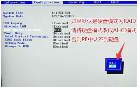 5、接著再返回configuration,查看sata controller mode選項,默認硬盤模式如果看到是RAID的話,就要把它改成AHCI模式,改完后按下f10保存設置。
