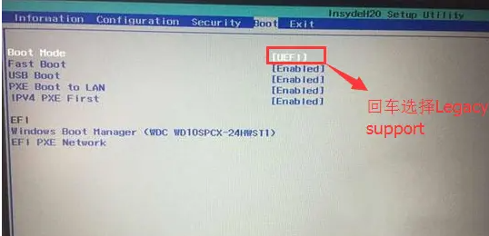 3、切換到boot選項,把 Boot Mode 從 UEF 改成 Legacy Support,就能讓主板支持傳統引導模式,然后就可以用u盤重裝系統了。