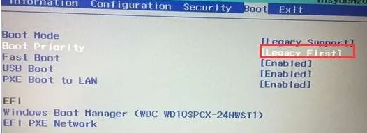 4、我們把 Boot Priority 設置成 Legacy First 選項,設置完成后按下f10,接著選擇yes。