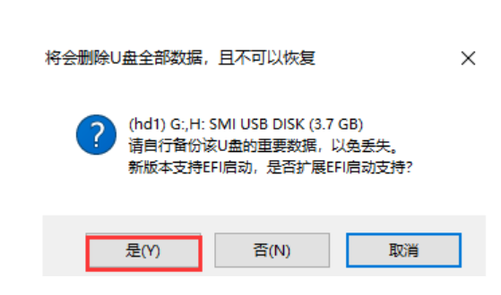 4、 在彈出的信息提示窗口界面中,點擊“是”(注:制作啟動盤將會格式化U盤,請大家提前備份好U盤數據)。