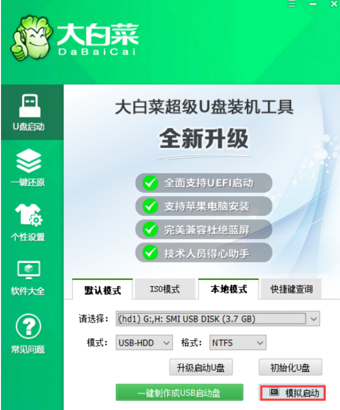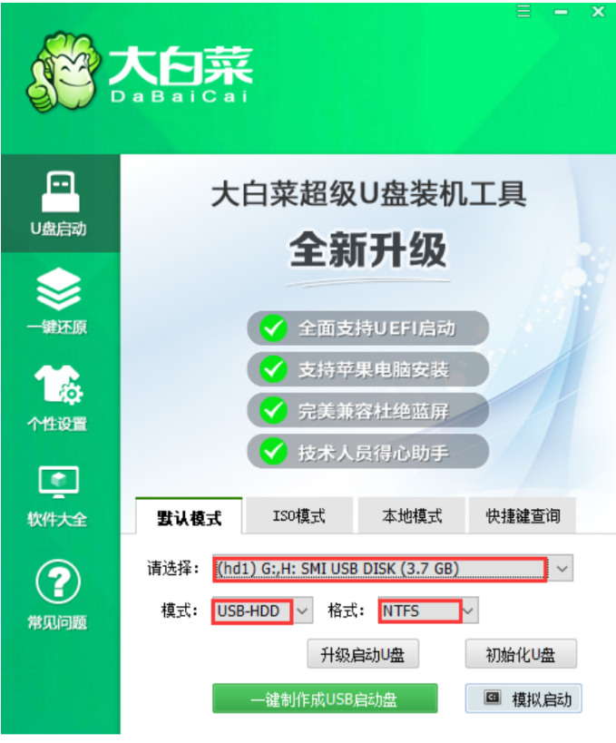 1、 下載安裝好大白菜裝機版,電機打開軟件并插入U盤。