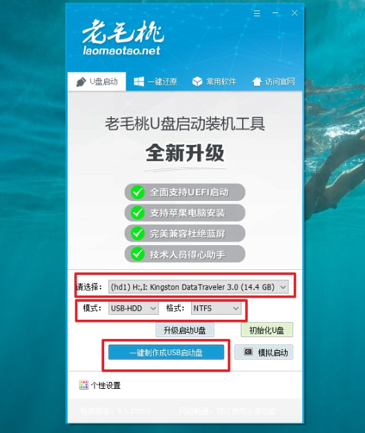 1、進入老毛桃官網下載老毛桃u盤啟動盤制作工具,解壓后打開。將空白u盤接入電腦,自動識別后,默認USB—HDD和NTFS設置,點擊一鍵制作u盤啟動盤。