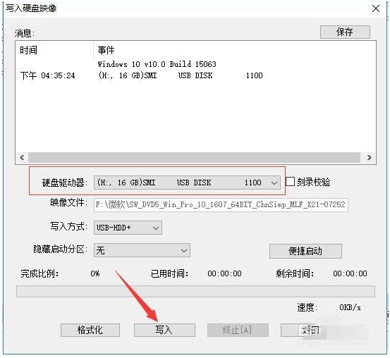 4、在“寫入硬盤映像”窗口,硬盤驅動器會選擇U盤(如果電腦上插了多個U盤,在這里可以選擇使用哪個),點擊【寫入】。彈出“數據丟失”的提示,點擊【是】繼續。