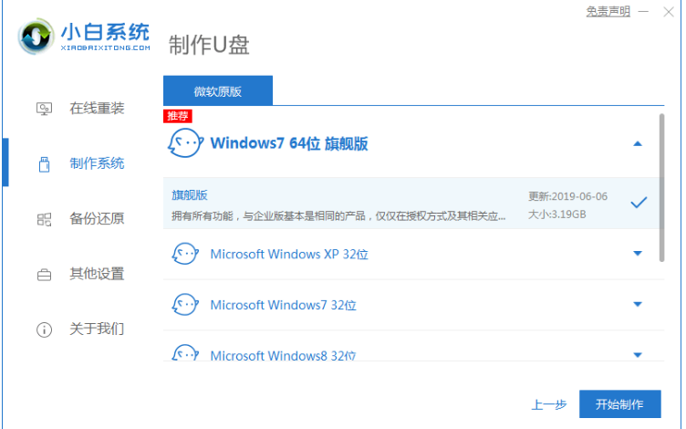 1、 首先插入U盤,打開小白軟件選擇“制作系統“,在制作系統界面中選擇制作 U 盤,在選擇 U 盤中選擇您的 U 盤,其它參數認,點擊開始制作。