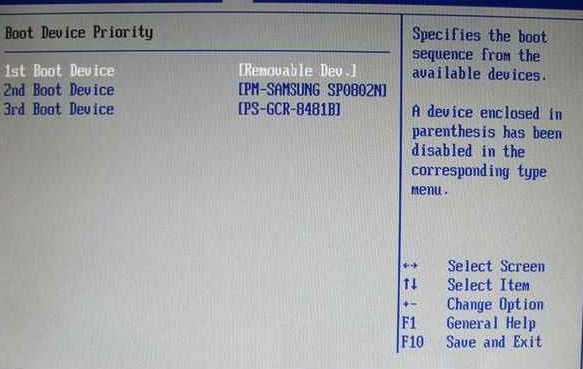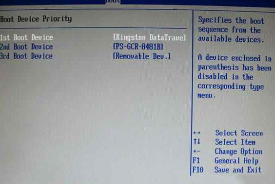 2.啟動優先級設備選擇(Boot Device Priority)在第一啟動設備(1st Boot Device)里選擇U盤,如果在硬盤驅動器“Hard Disk Drives”里面還沒選擇U盤為第一啟動設備,那么這里就不存在和顯示U盤,但可以選擇移動設備“Removable Dev.”作為第一啟動設備。