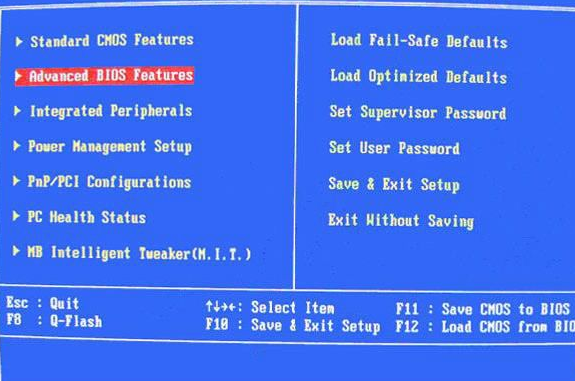 1.開機按Del鍵進入該BIOS設置界面,選擇高級BIOS設置:Advanced BIOS Features