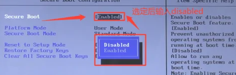 3.進入SecureBoot界面選定后置代碼輸入Disabled代碼,然后返回Security界面。