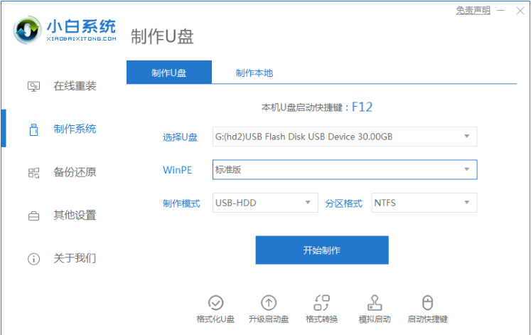 1.首先系統下載安裝好小白系統并打開,將U盤插到電腦,選擇開始制作啟動 U 盤,點擊開始制作。