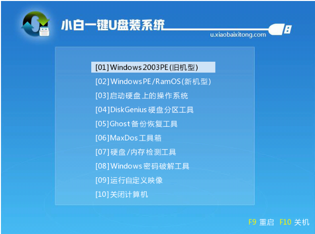 7、將U盤插入我么需要安裝系統的電腦,在開機時快速按下U盤啟動快捷鍵并設置USB為第一啟動項, 選擇【02】Windows PE/ramos(新機型)進入小白PE系統界面。