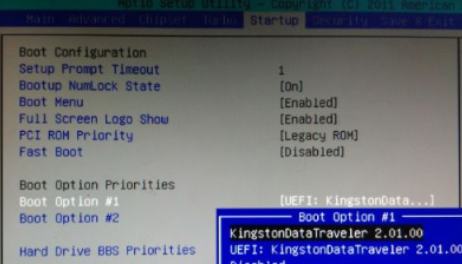 3.此時選擇Boot Option #1回車,按↑或↓方向鍵移動選擇,選擇識別到的U盤選項,按回車鍵,一般是帶有USB字樣或者U盤品牌名稱,比如下圖KingstonDataTraveler這個是金士頓U盤,選擇這個就是U盤啟動盤。