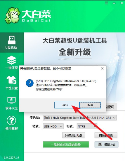 2.確認我們的操作,因為我們制作系統會把之前U盤里面的數據格式化,確定沒有重要的數據后,點擊確定進入下一步。