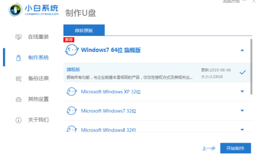 2、選擇我們要安裝的系統版本,這里我們以win7為例子,點擊開始制作。