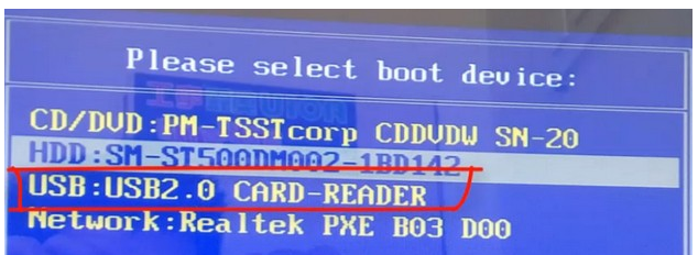 5、把電腦開機快速斷續的按熱鍵進入快速啟動菜單,選擇帶usb的選項,回車鍵進入PE選擇界面。