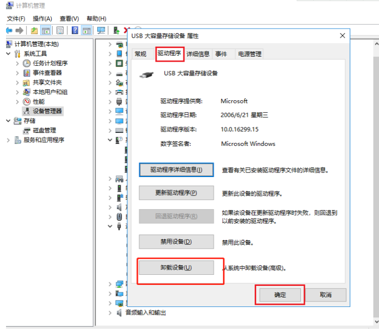8、 在彈出的窗口界面中,點擊「驅動程序」-「卸載設備」-「確定」,卸載完成之后,將U盤重新插到電腦,系統將會自動加載U盤驅動,最后檢查一下U盤是否被讀取即可。
