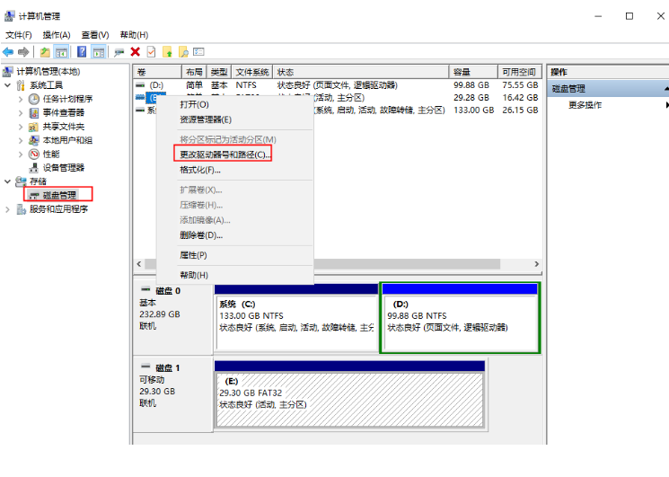 5、進入到「計算機管理」頁面,在右方「存儲」-「磁盤管理」,找到「可移動磁盤」,點擊「更改驅動器號和路徑」。