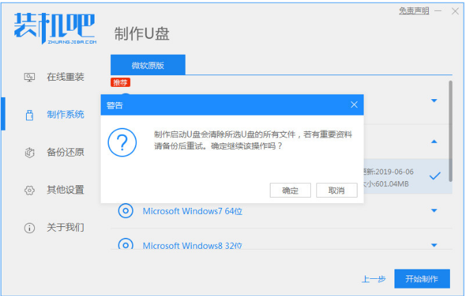1、 u盤啟動盤裝win10系統,首先需要準備一個8G空白U盤,下載安裝裝機吧一鍵重裝系統軟件,將u盤插到電腦,點擊開始制作。