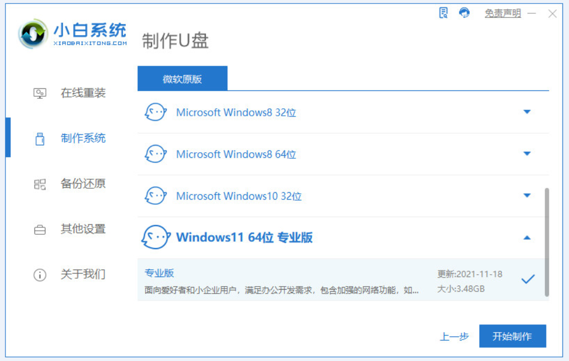 1、下載并安裝小白一鍵重裝系統,在電腦上插入一個空白u盤,選擇制作系統,進入制作u盤界面,設置好參數后點擊開始制作。