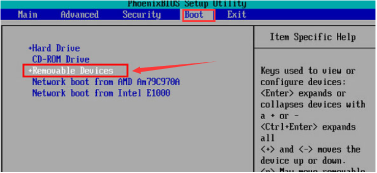 2.把鼠標光標移動到“boot”,找到u盤的選項,小編這里是“removeble device”。