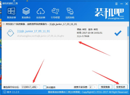 10、進入PE系統之后自動彈出裝機吧裝機工具,選擇要安裝的系統,目標分區選擇系統盤C盤,選擇點擊安裝系統等待系統的安裝,安裝完成之后拔除U盤,將重啟電腦。