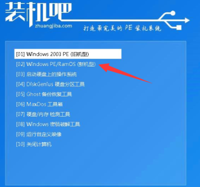 8、進入PE選擇界面,選擇02新機型,按回車鍵確定。