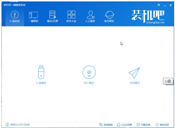 1、首先下載裝機吧一鍵重裝系統軟件。將U盤插入電腦,打開裝機吧軟件選擇U盤啟動>>U盤模式。