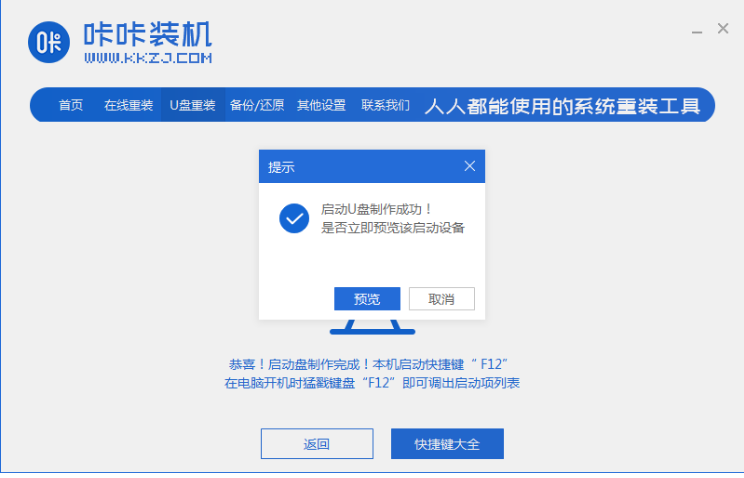 6、然后U盤啟動盤制作成功,點擊預覽,記住自己電腦的啟動快捷鍵即可。