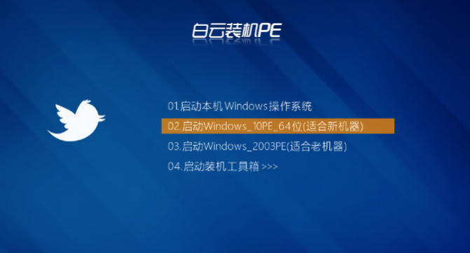 11、白云裝機PE下,新電腦按回車選擇【02.啟動Windows_10PE_64位(適合新機器)】,舊電腦按回車選擇【03.啟動Windows_2003PE_64位(適合老機器)】;