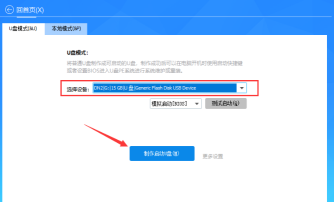 4、U盤模式:將普通U盤制作成可啟動的U盤,制作成功后可以在電腦開機時使用啟動快捷鍵或者設置BIOS進入U盤PE系統進行系統維護或重裝。選擇設備這里選擇【U盤】,再點擊【制作啟動U盤】;