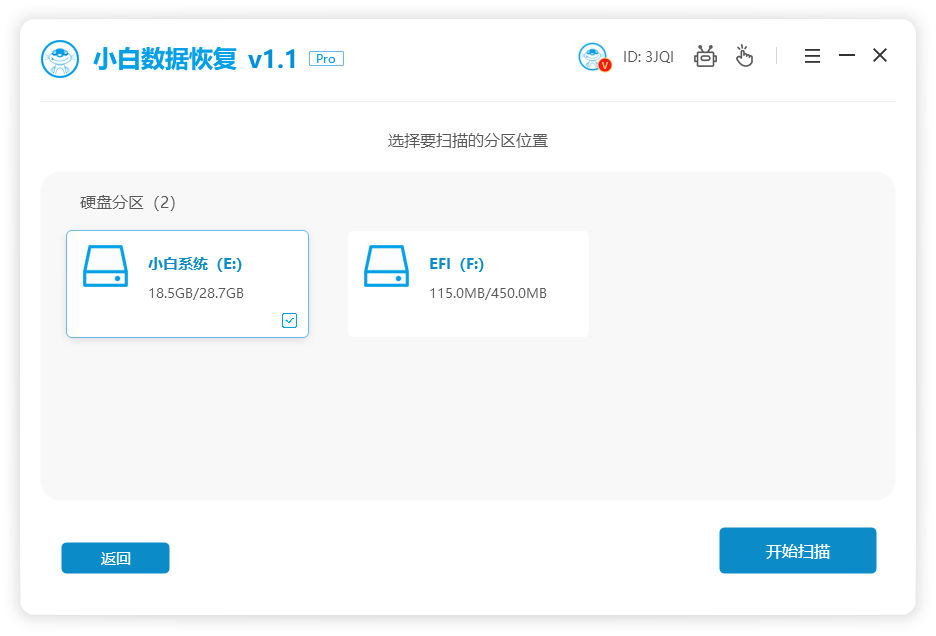 1、百度搜索下載小白數據恢復軟件,運行并打開,將u盤插入電腦,點擊U盤/內存卡恢復,點擊開始掃描。