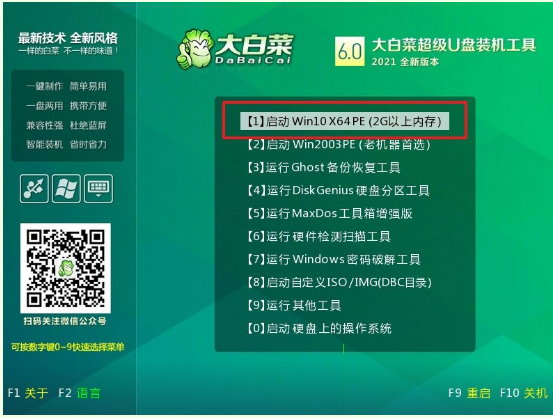 2. 進入大白菜winpe主菜單,點擊【1】Win10X64PE(2G以上內存),再按回車鍵進入winpe桌面。