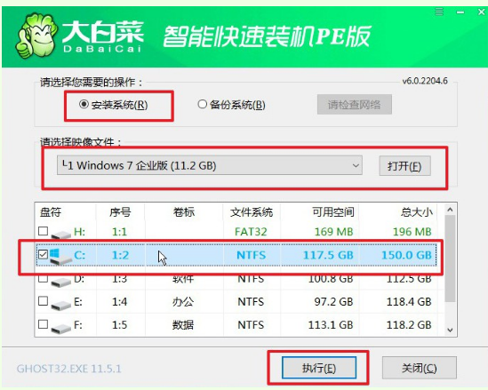 1. 打開大白菜一鍵重裝軟件,點擊“安裝系統”,點擊win7鏡像系統作為“映像文件”,安裝在“C盤”中,點擊“執行”。