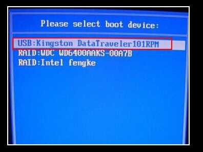 1. 把制作好的大白菜U盤啟動盤接入電腦,重啟電腦時,快速按下U盤啟動快捷鍵,進到啟動設置界面,使用上下方向鍵選中U盤,按回車鍵。