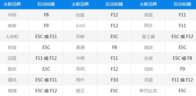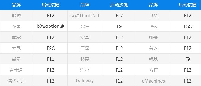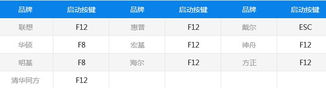 4.系統文件準備好后,下一步就是進入PE才能進行重裝,首先根據自身電腦型號查詢U盤啟動快捷鍵、如不知道自身電腦型號,也可在開機時分別嘗試“F12、F8、ESC”鍵,大部分電腦選擇啟動順序都是這三個快捷鍵其中一個,或者看一下小編提供的參照表,如果還是沒有的話,也可以問一下購買電腦的時候的客服。