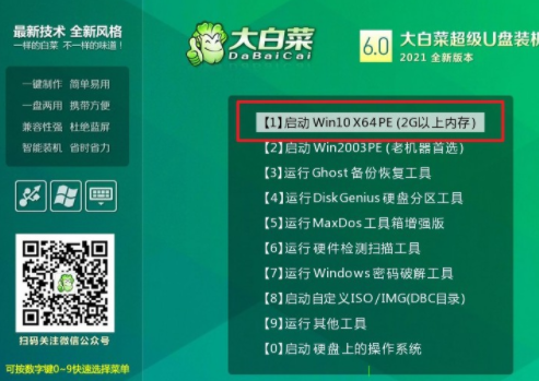 6.進入大白菜主菜單后,通過“↑↓”鍵選擇“【1】啟動Win10 X64PE(2G以上內存)”后回車確認,成功進入大白菜pe界面。