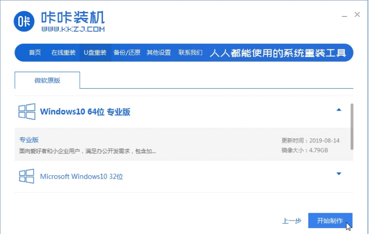 1、自行在可用的電腦上下載安裝好咔咔裝機一鍵重裝系統工具并打開,插入空白u盤,選擇u盤重裝欄目,選擇開始制作。