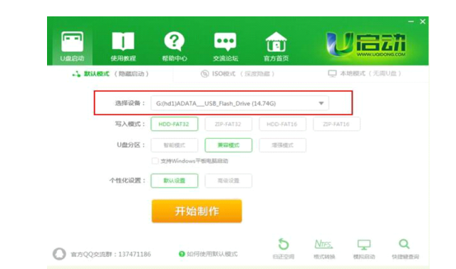 安裝完成之后打開軟件,并將u盤插入電腦當中,軟件會自動識別到u盤的信息以及名稱;如圖所示:
