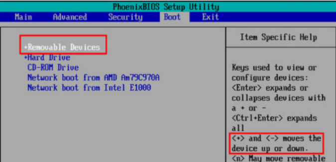 3.接著按+鍵將removebledevice移動到最上面進行設置u盤啟動。