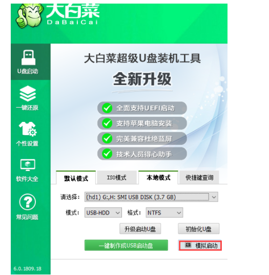 1、大白菜u盤裝系統設置u盤啟動如何操作呢?下載安裝大白菜超級u盤裝機工具,點擊主界面U盤啟動模塊,選擇默認模式,再選擇我們需要的設備。