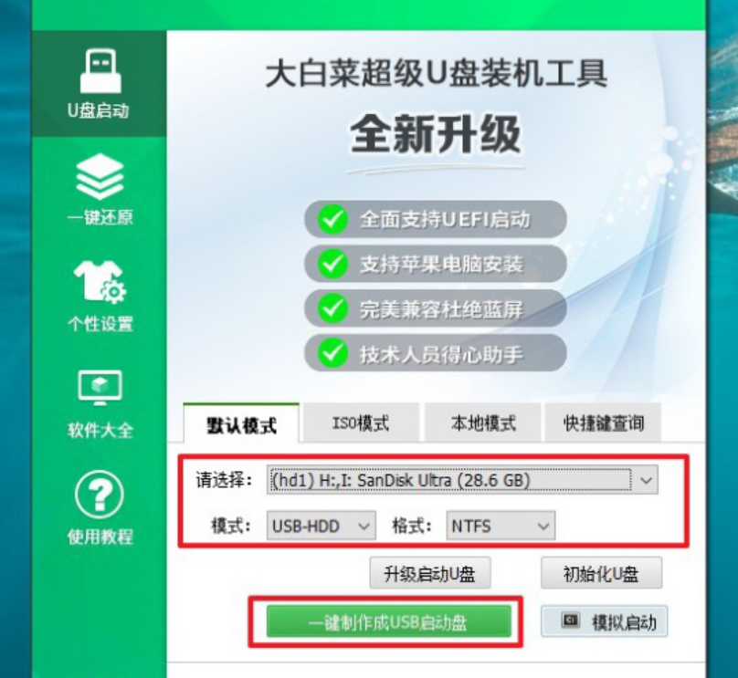 2、安裝后打開大白菜U盤啟動盤制作工具,等待自動識別U盤后,點擊一鍵制作成U盤啟動盤。