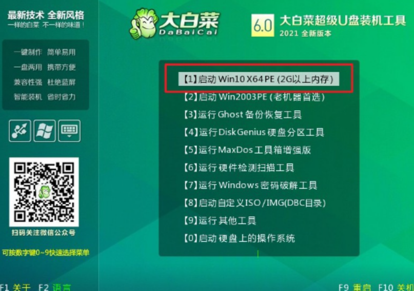 4、進入到大白菜主菜單,選擇【1】按回車進入winpe桌面。