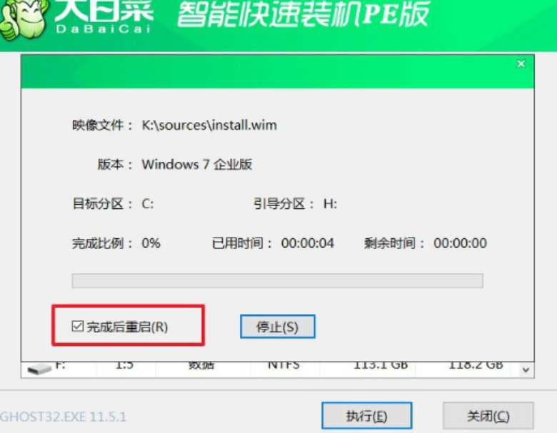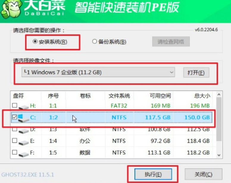 5、pe內,打開大白菜一鍵裝機軟件,選擇安裝win7系統在“C盤”,點擊“執行”。