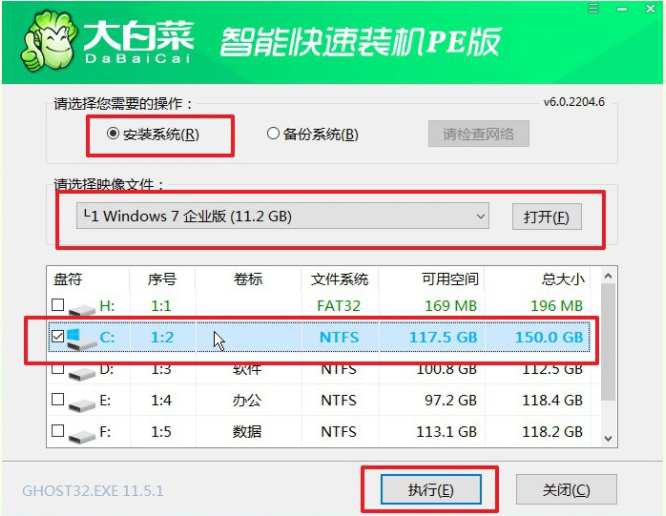 5、返回桌面點擊打開大白菜軟件,選擇“安裝系統”,找到win7鏡像系統,安裝路徑為“C盤”,鼠標點擊“執行”。