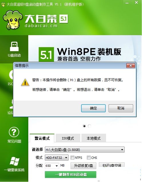2、插入U盤到電腦,大白菜將會自動識別到U盤,點擊“一鍵制作USB啟動盤”,彈出提示框,點擊確定即可;