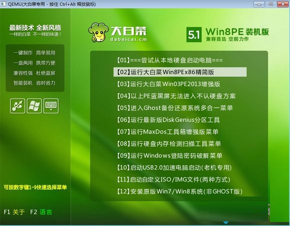 5、如果可以打開大白菜U盤啟動盤模擬界面,說明重裝系統U盤制作成功;