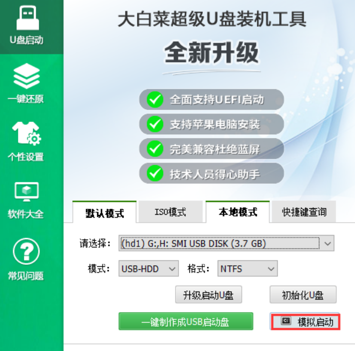 1.下載安裝大白菜版,打開軟件插入u盤。