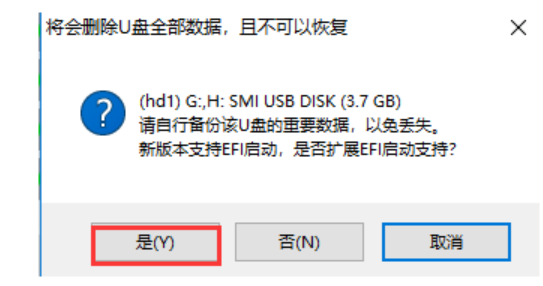 4.點擊一鍵制作后,彈出一個關于u盤數據刪除且無法恢復的窗口,選擇是。