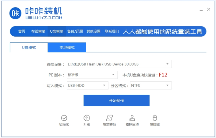 1、打開咔咔一鍵重裝系統工具,插入u盤開始制作u盤啟動盤;