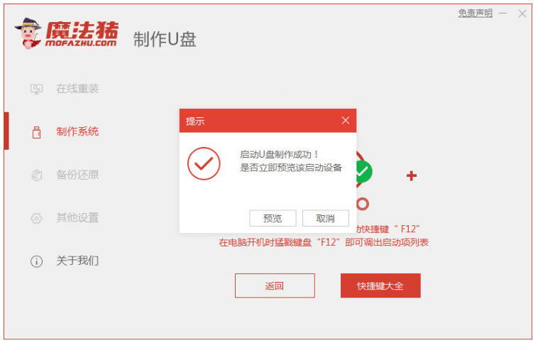 3、提示“啟動u盤制作成功”之后,可以先預覽查看需要安裝的臺式電腦主板的啟動熱鍵,然后再拔掉u盤退出。