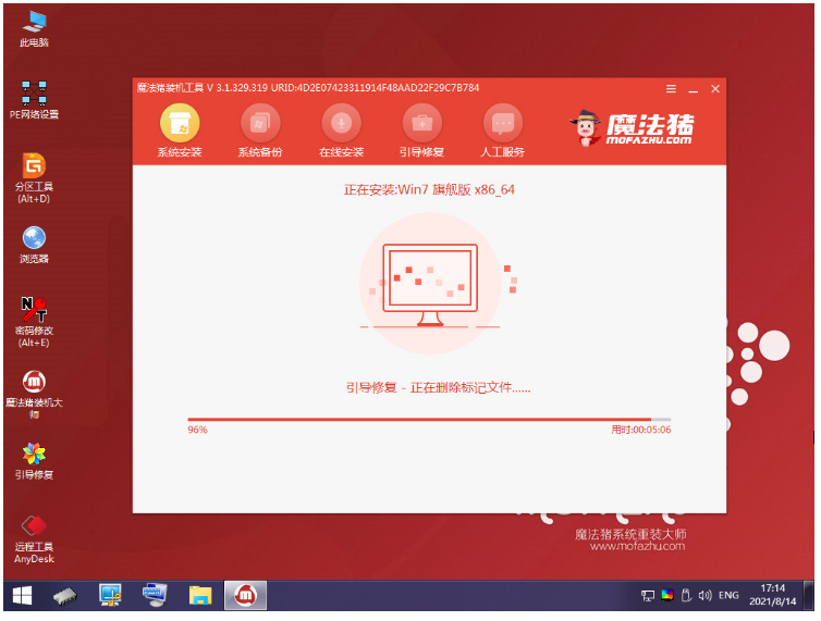 5、電腦在pe系統桌面上,打開魔法豬裝機工具,繼續安裝win7系統。