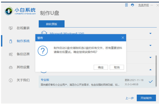 2.選擇要安裝的系統,制作U盤啟動盤之前,備份好U盤里數據,點擊確定。